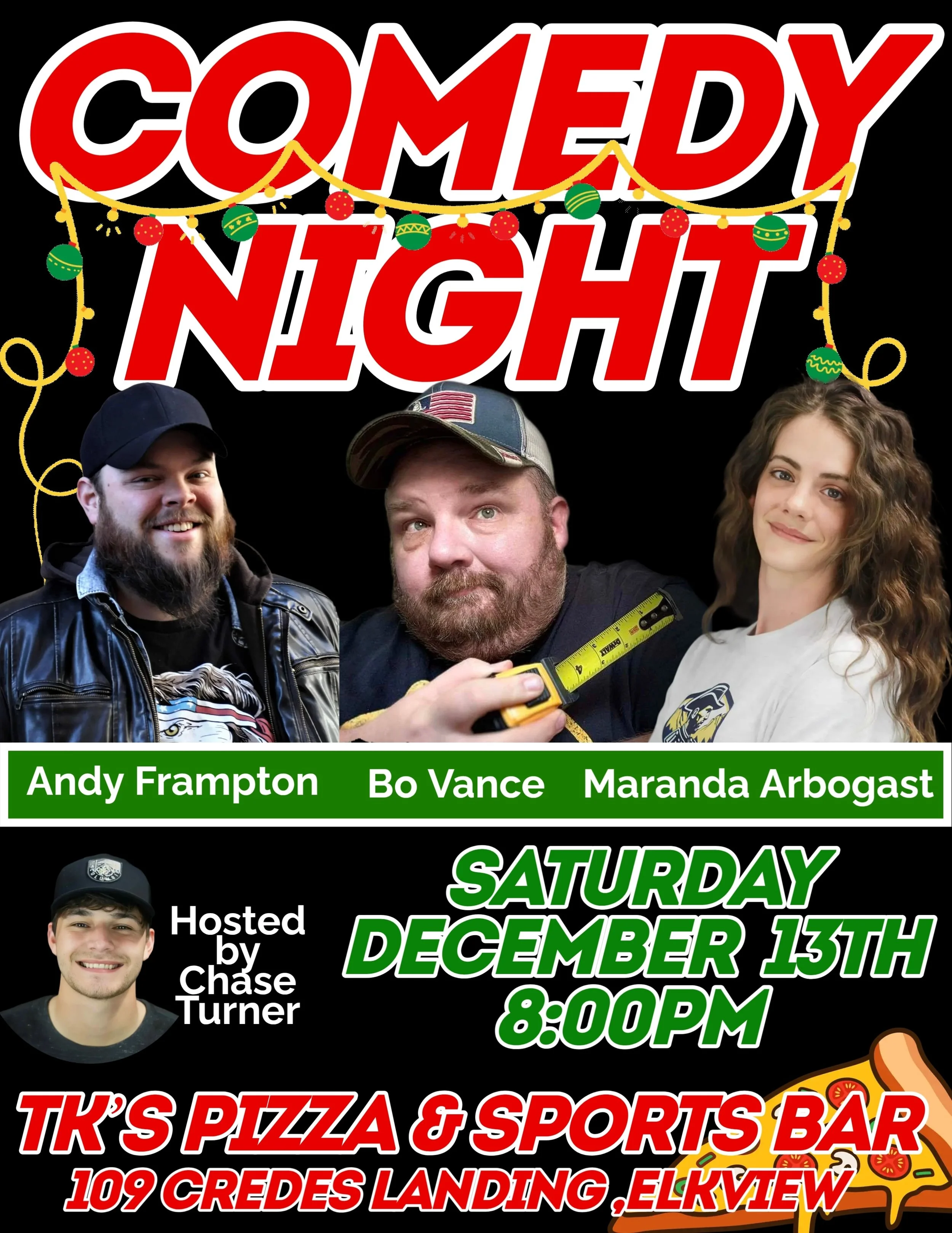 Pizza, Beer & Comedy! Come on out to Elkview for a hysterical night of fun! TK’s Pizza & Sports Bar is once again bringing some of West Virginia’s funniest comedians for the funniest show in the area. Bo Vance, Maranda Arbogast, Andy Frampton, and Chase Turner are gonna make you pee your britches!